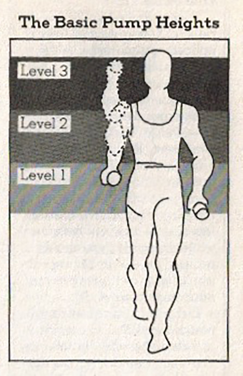 There are three standard levels to the pump and each level represents one foot: “Measuring with the hands hanging straight down at your sides, if you’re about average height, Level 1 hits you about belly button high, Level 2 near the front of the shoulder joint, Level 3 about the top of your head.” You can also shoot for the moon and go for Level 4, pumping “about as high as most of us can pump without losing the limb!” The higher you pump, the harder the work. The different pump levels also emphasize different muscles, with levels 1 and 2 targeting the arms, and 3 and 4 recruiting your shoulders, upper back, and chest.
